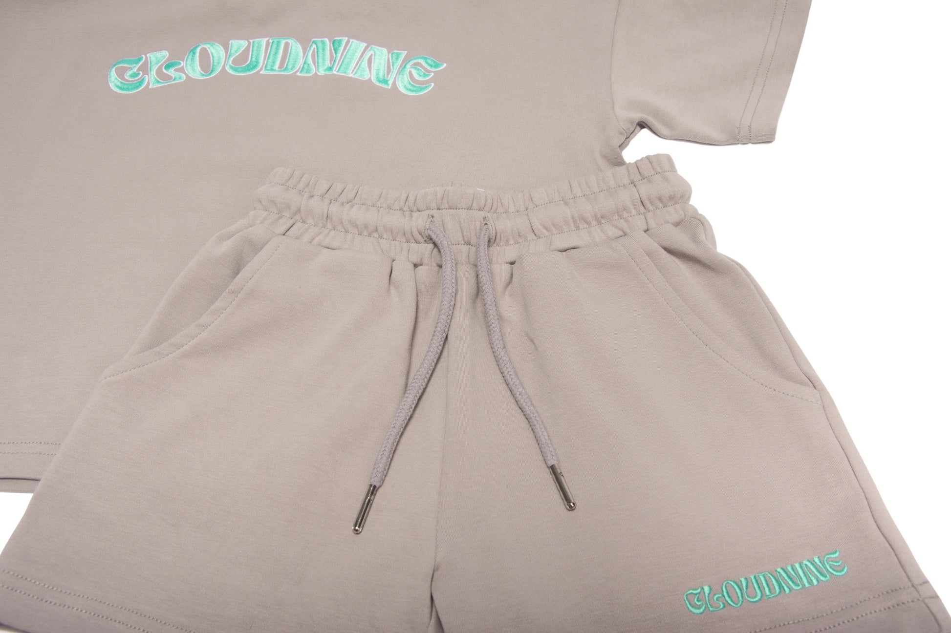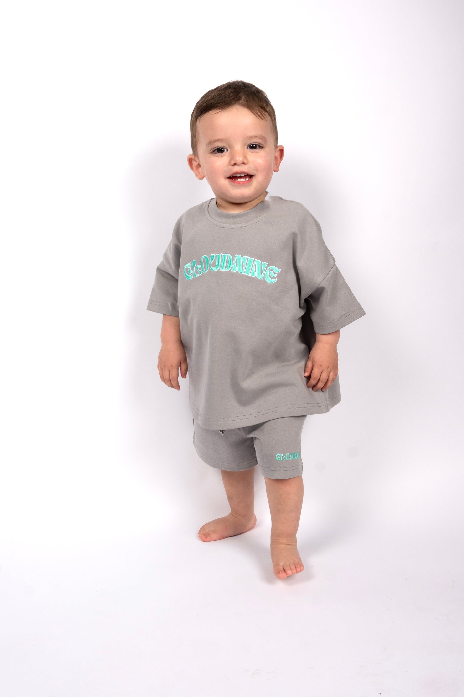 Grey shirt with aquamarine embroidered logo Oversized Tee + Dynamic Shorts